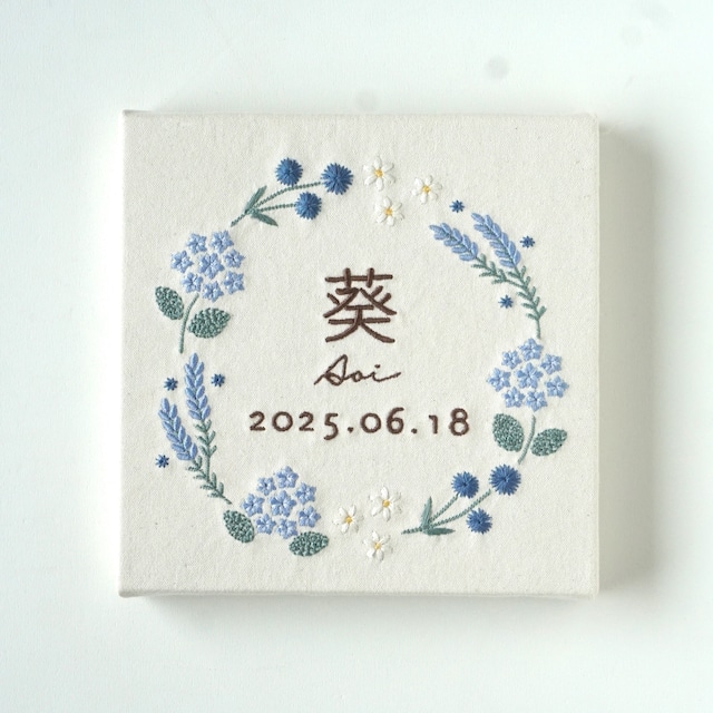 _____________ こちらの作品はオーダー製作となります。 現在ご入金から発送まで約5日程度(土日祝を除く)お時間をいただいております。 _____________ お子さんのお名前を ふっくらとあたたかみのある刺繍で彩る命名パネルです。 紫陽花をモチーフにしたリースを やわらかなブルー系の3色の糸を使って繊細な刺繍で表現しました。 生地は国産のコットンキャンバス生地を使用しています。 お子さんのお誕生の記念に・・・ お七夜、節句のお祝いなどの特別な記念の席にご活用いただけることはもちろん、 ふだんの暮らしの中にも取り入れていただけるように お部屋のインテリアに馴染む雰囲気を心がけて制作しております。 _____________ 【商品について】 パネルサイズ:18cm × 18cm 厚さ:2cm 生地:コットンキャンバス (日本製) ※キナリの生地は漂白等をしていない自然素材そのものの状態のため、生地表面に植物の破片など(綿カス)が混入している場合がございます。あらかじめご了承ください。 【オプション】 ★身長体重刺繍オプション +300円 お誕生日の下に生まれた時の身長と体重をお入れします。 ご希望の際はオプションで選択の上、備考欄に身長体重の記載をお願いいたします。 【ご注文方法】 ご注文手続きに進み、備考欄に以下のご記入をお願いいたします。 ・お名前 ・お名前のローマ字表記(例:Marika) ・生年月日(例:2023.10.10) ・作品例としてインスタ掲載にご協力いただける場合は「OK」と記入していただけるとありがたいです。 (NGの場合は未記入で大丈夫です) ※旧字体など一部お入れできない漢字がございます。 ご心配がある場合は、ご注文前にメッセージにてご確認をお願いいたします。 【ギフトラッピング】 ◎ギフトラッピング+300円 ギフトラッピングを承っております。 かけ紙とリボンでのラッピングとなります。 ご希望の場合は、オプションにてギフトラッピングを選択の上、ご注文をお願いいたします。 _____________ 【配送方法について】 ◎クリックポスト 全国一律185円 ・ポスト投函 ・追跡有り ・補償無し ※土日の配達はありますが、配達日数は普通郵便と同等程度で3〜4日お時間がかかります。