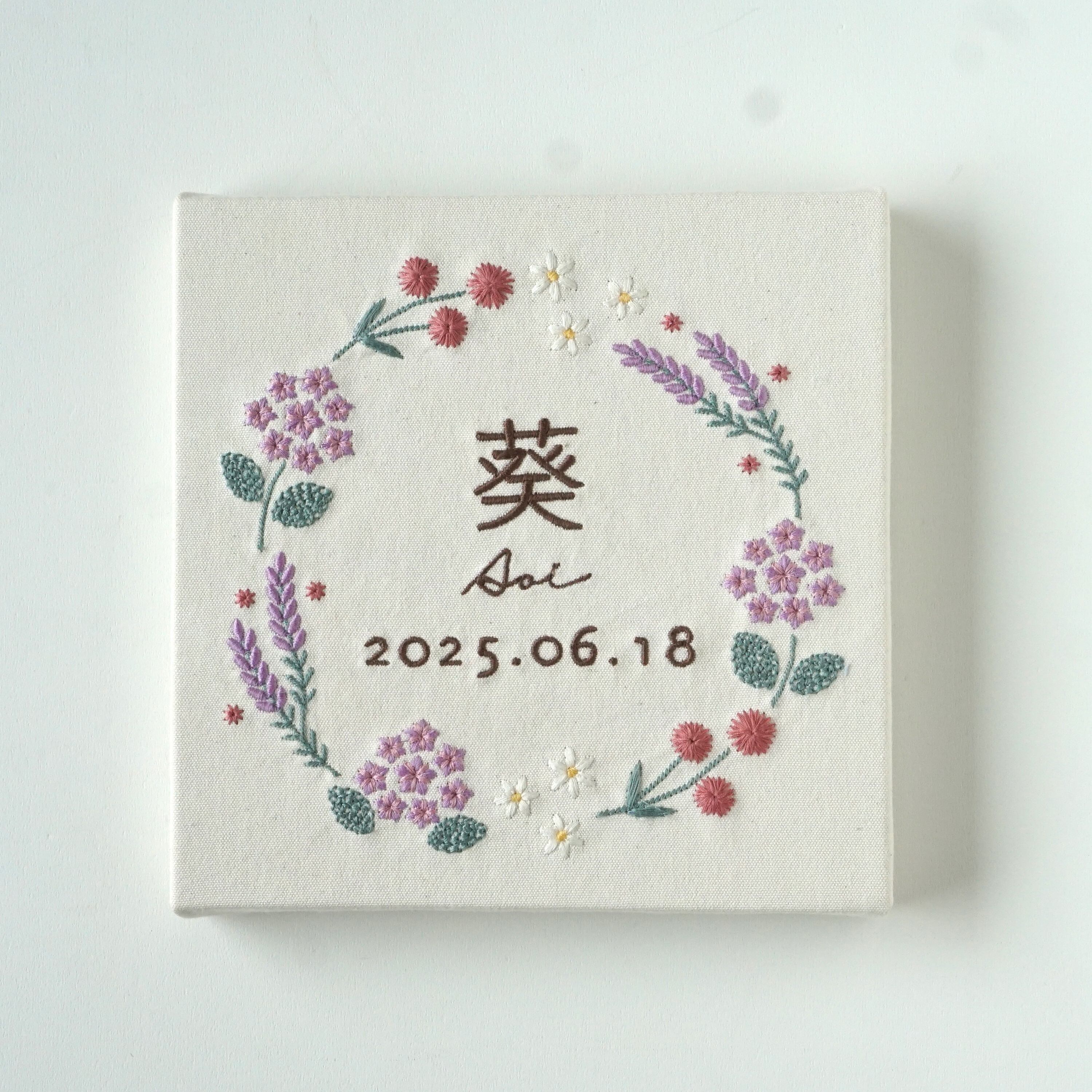 ふっくらとあたたかみのある刺繍で彩る命名パネルです。