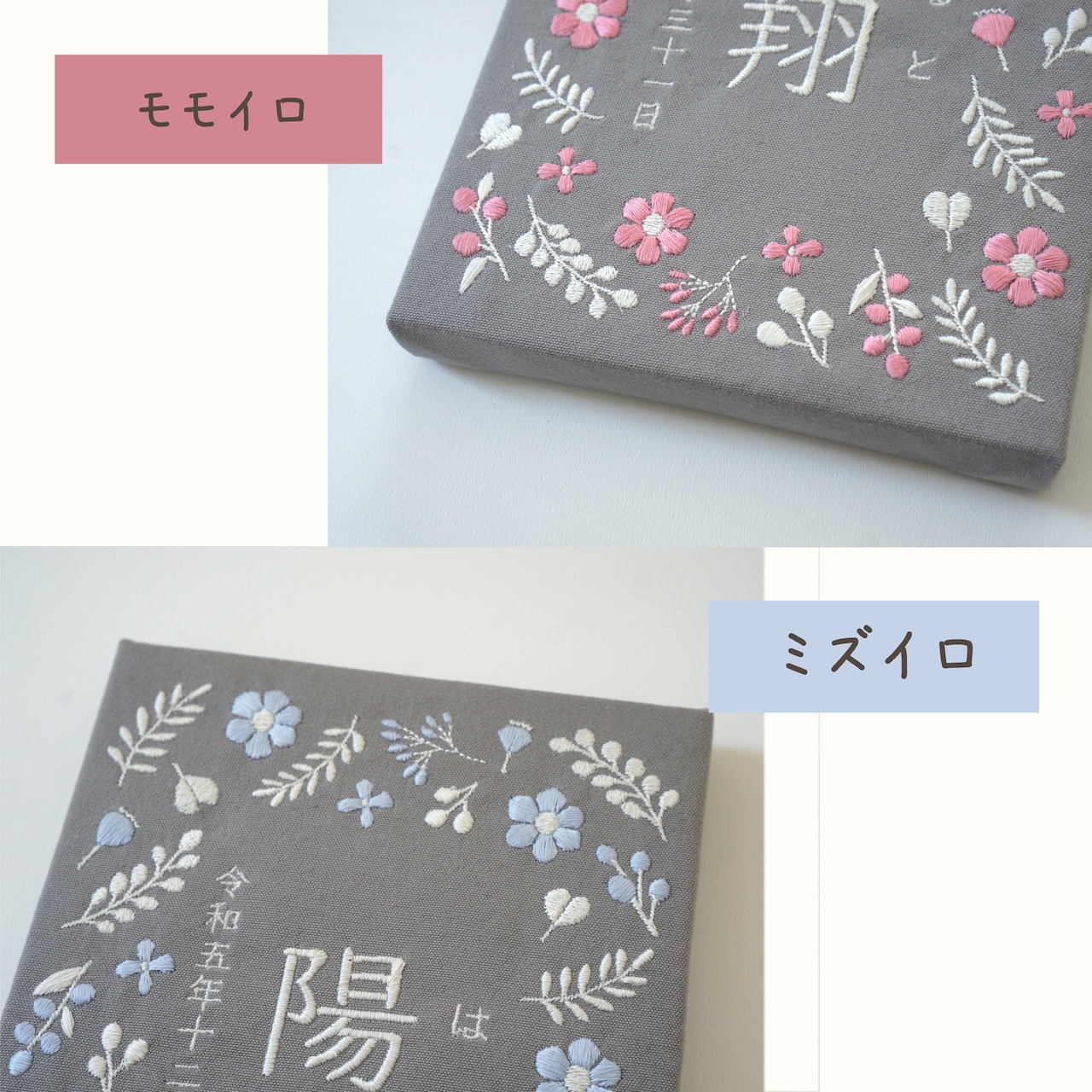 ふっくらとあたたかみのある刺繍で彩る命名パネルです。