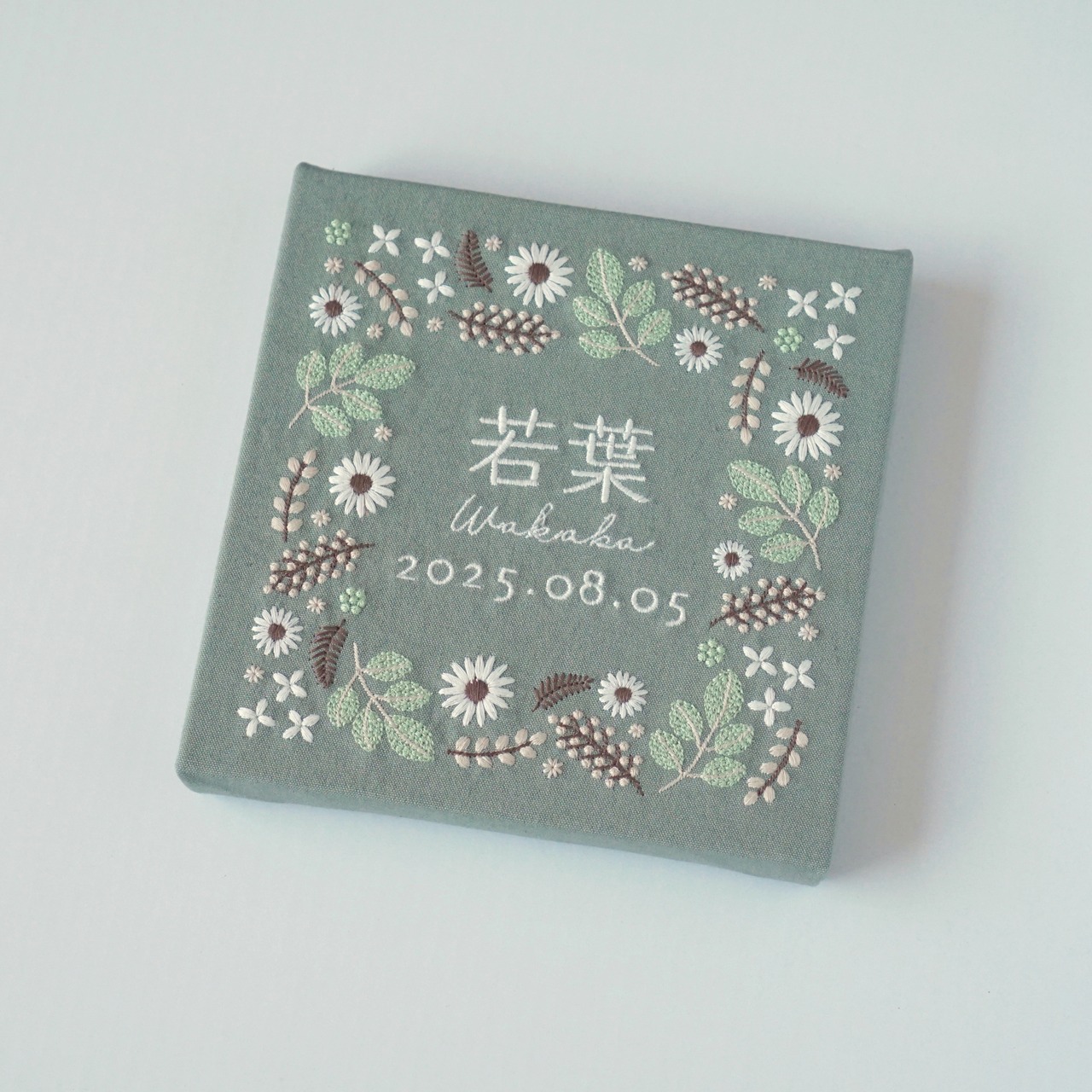 ふっくらとあたたかみのある刺繍で彩る命名パネルです。