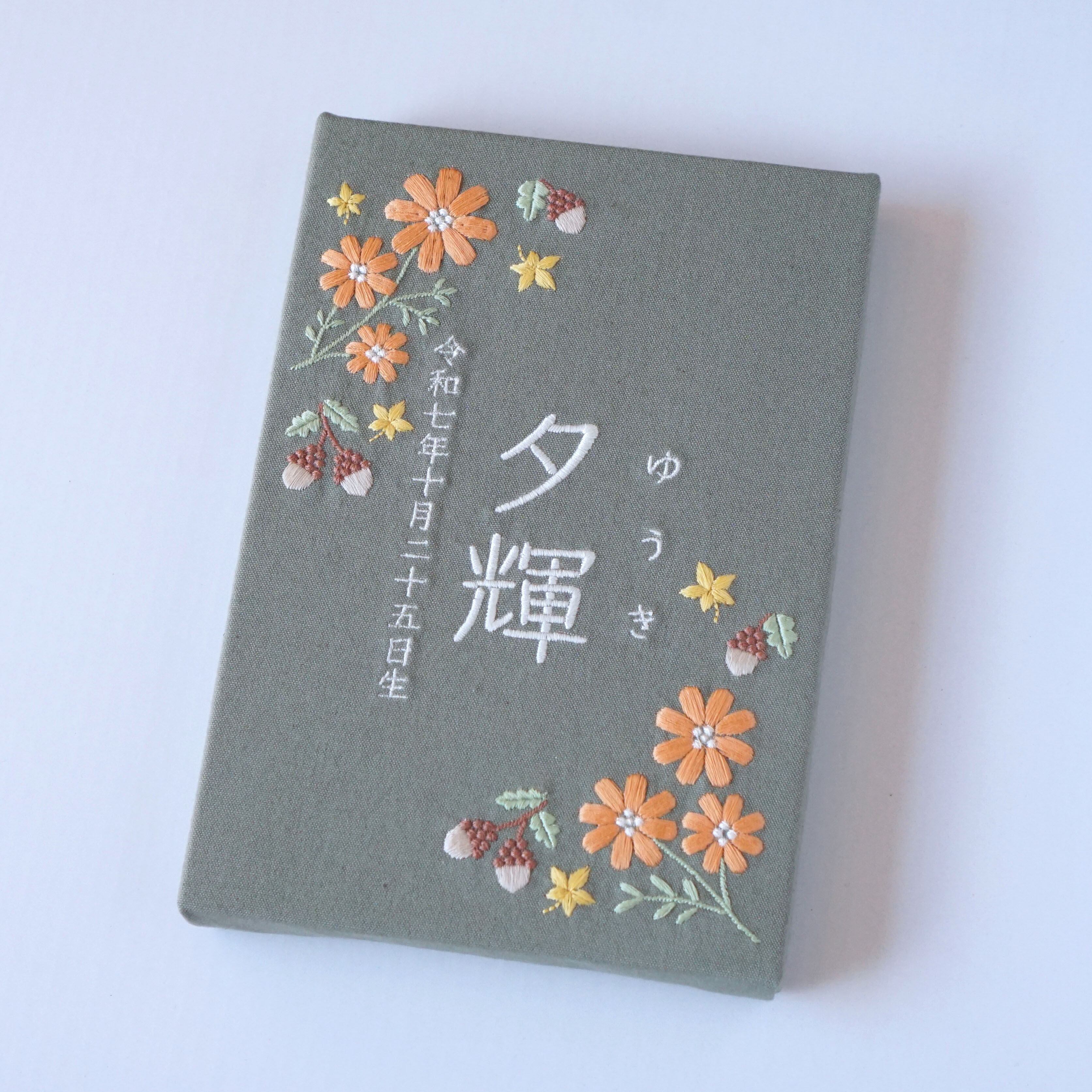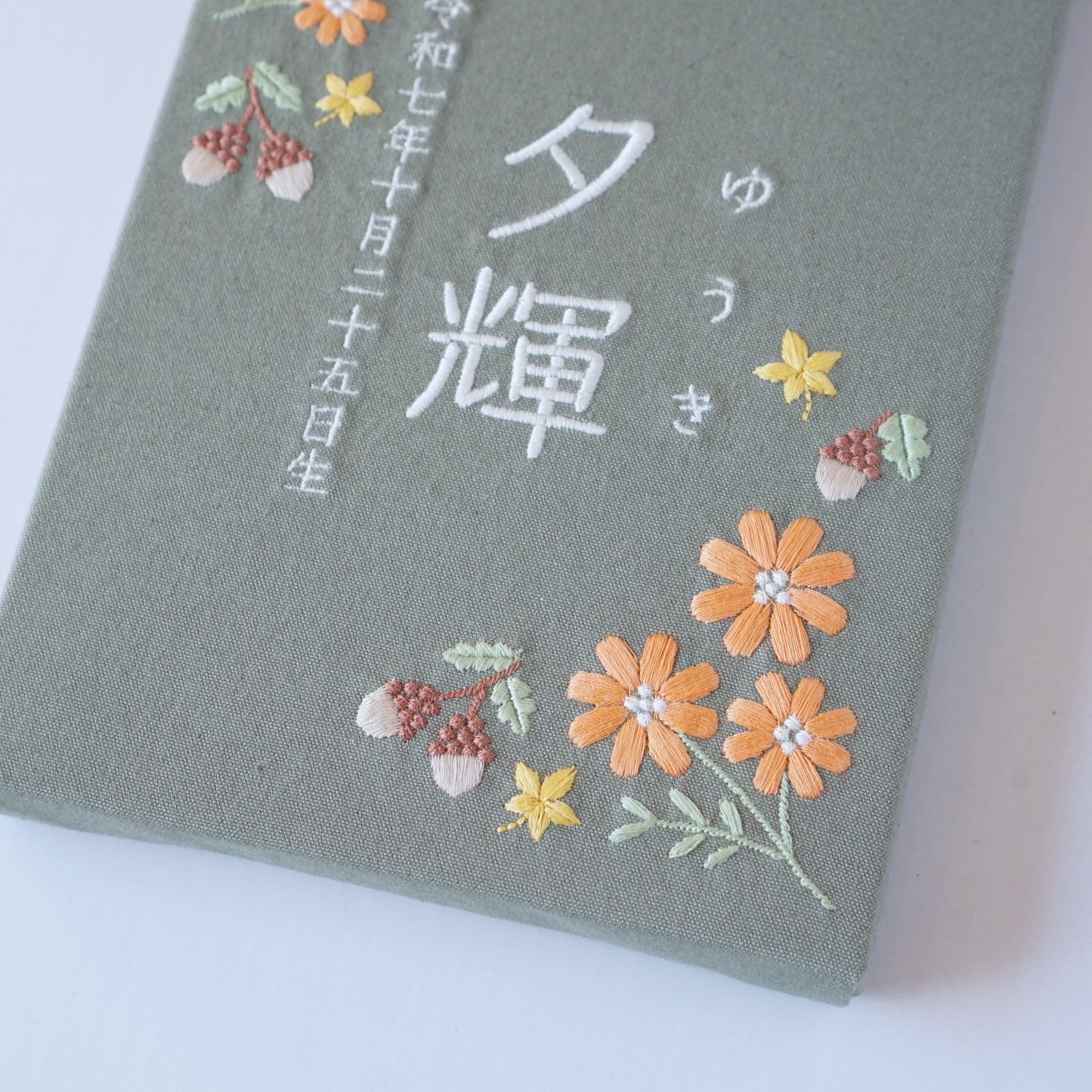 ふっくらとあたたかみのある刺繍で彩る命名パネルです。