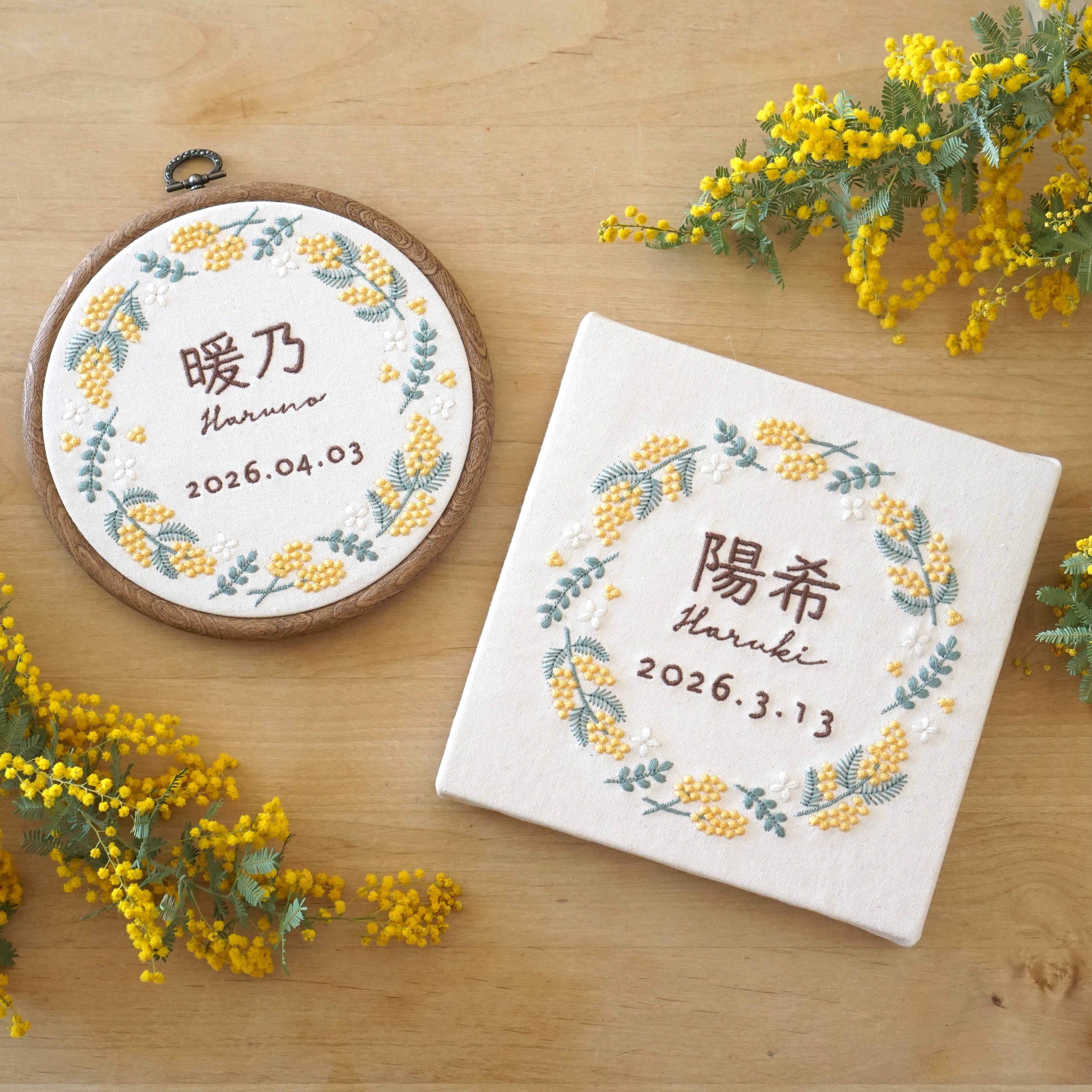 刺繍の命名書 ミモザのリース / まんまる刺繍枠