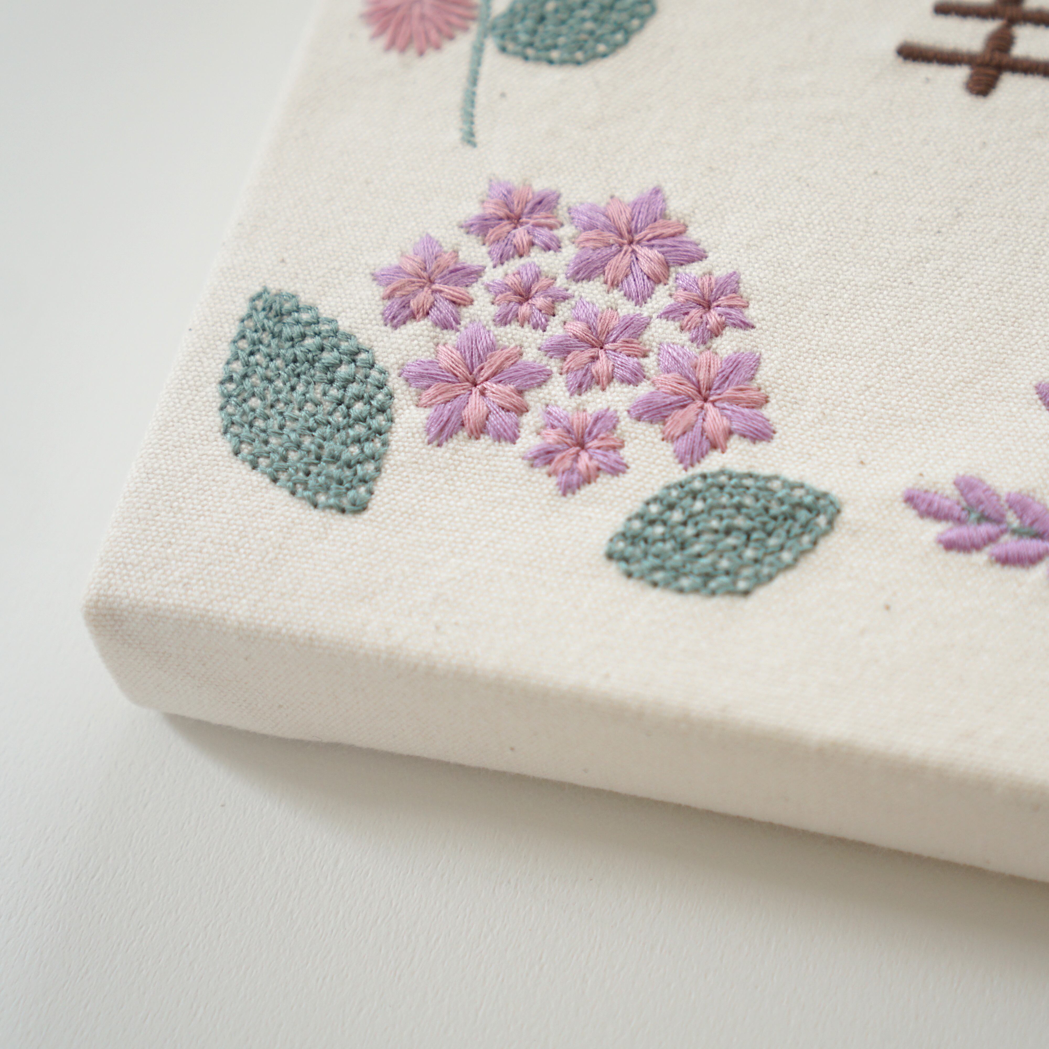 ナチュラルなコットンキャンバス生地に紫陽花をモチーフにデザインした刺繍を相性のいい2色の糸で仕上げました。