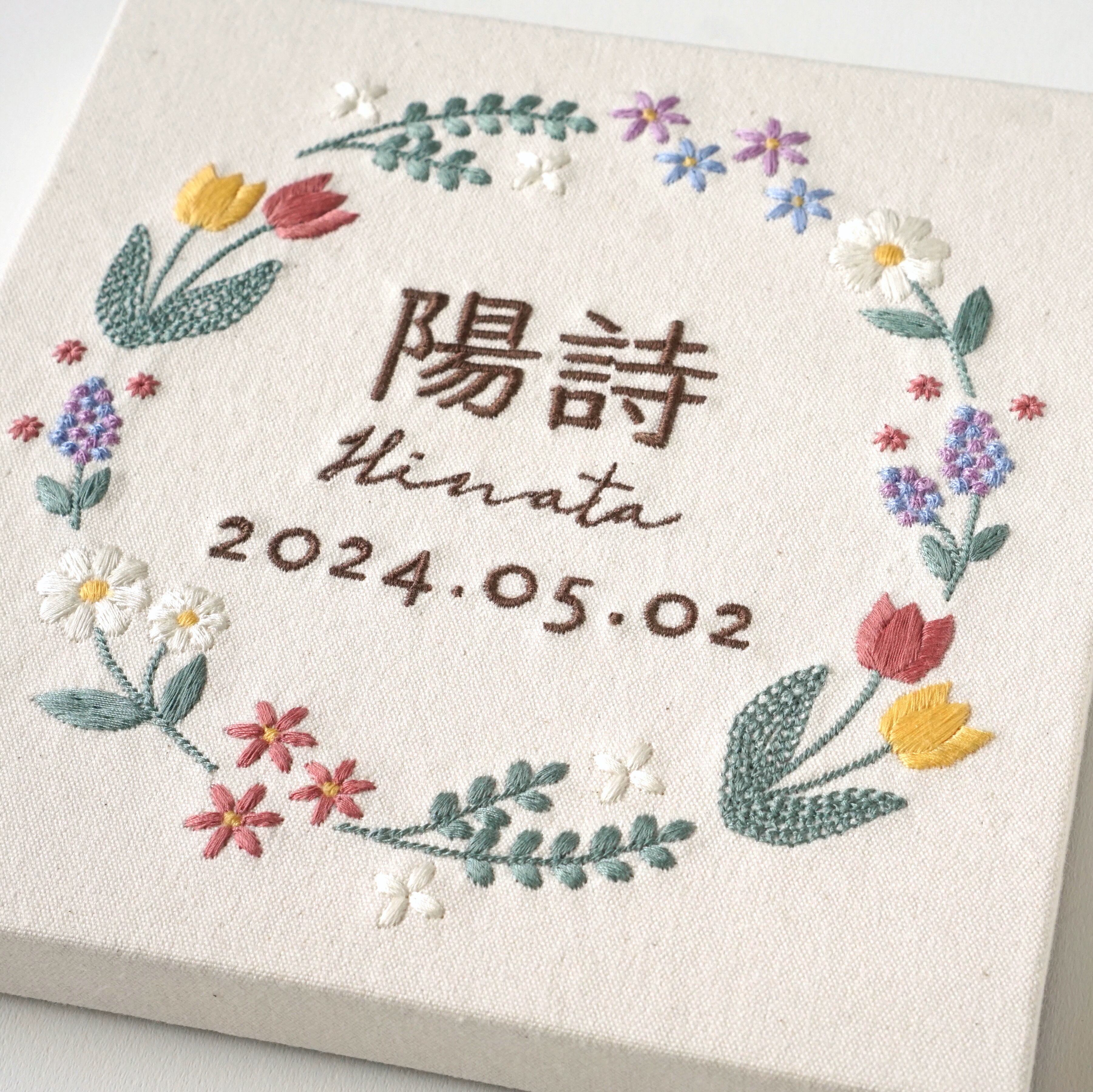 お子さんのお名前をふっくらとあたたかみのある刺繍で彩る命名パネルです。