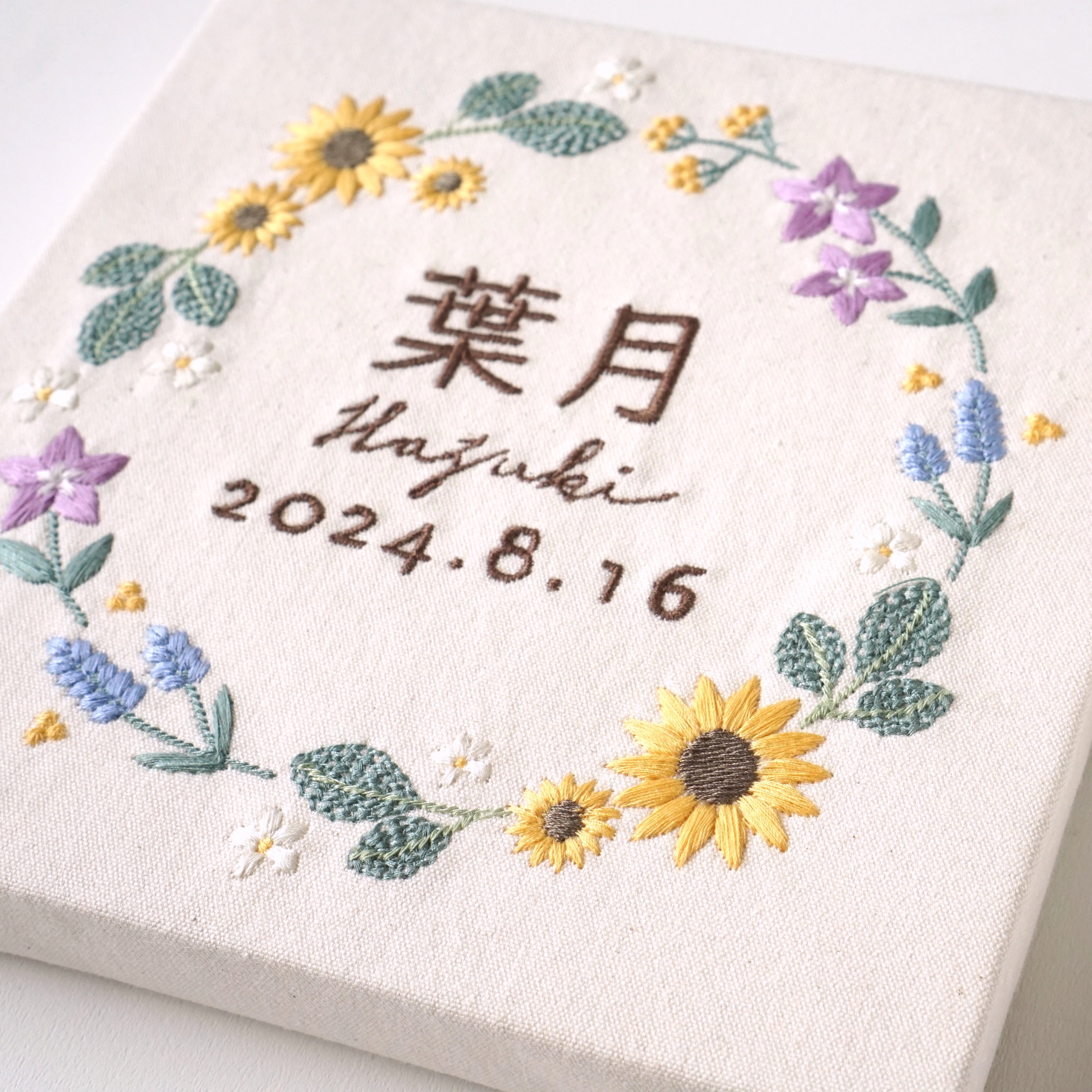 お子さんのお名前をふっくらとあたたかみのある刺繍で彩る命名パネルです。